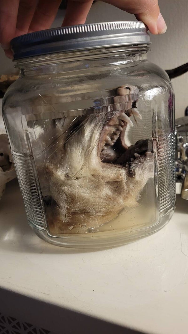 Ethically sourced opossum head. Will come with jar you will have to add liquid.